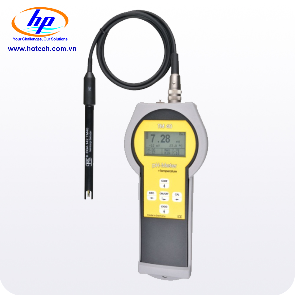 Máy đo pH cầm tay TM 40 kết hợp các tính năng cho ứng dụng di động tại hiện trường với độ chính xác và tiện nghi như máy đo trong phòng thí nghiệm với menu đơn giản, tích hợp hệ thống ghi dữ liệu và vỏ máy được bảo vệ IP 65 chắc chắn, kín nước.Máy đo pH cầm tay TM 40 có khả năng tự động bù nhiệt độ cho phép đo pH cũng như nhiệt độ tham chiếu có thể điều chỉnh được với các phép đo không có cảm biến nhiệt độ. Để hiệu chuẩn, có thể sử dụng quy trình hiệu chuẩn hai điểm thủ công hoặc tự động. Các ứng dụng có thể có của TM 40 là phép đo thế oxy hóa khử (ORP) hoặc ISE so với điện cực hydro tiêu chuẩn theo DIN 38404.