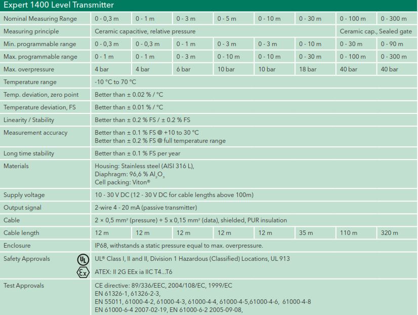 Thiết bị quan trắc mực nước Expert™ 1400 với độ chính xác được cải thiện với cả khoảng đo cao và thấp. Các đầu dò được cấp phép sử dụng để lắp đặt tại các khu vực độc hại hoặc dễ cháy nổ. Thiết bị quan trắc mực nước này có một hệ thống đo tốt và ổng thở tích hợp để bù áp suất không khí trực tiếp.