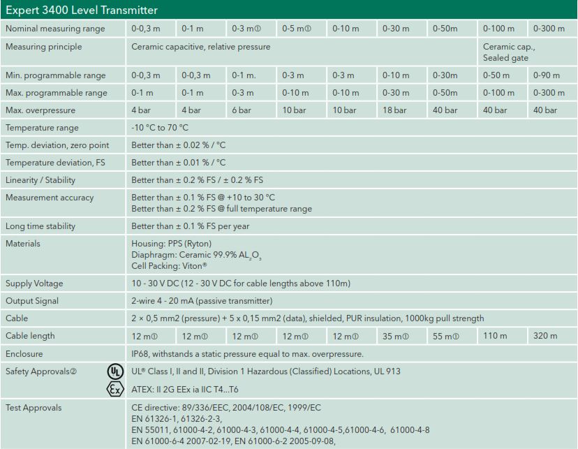 Thiết bị quan trắc mực nước Expert™ 3400 với độ chính xác được cải thiện với cả khoảng đo cao và thấp. Các đầu dò được cấp phép sử dụng để lắp đặt tại các khu vực độc hại hoặc dễ cháy nổ. Thiết bị quan trắc mực nước này có một hệ thống đo tốt và ổng thở tích hợp để bù áp suất không khí trực tiếp.