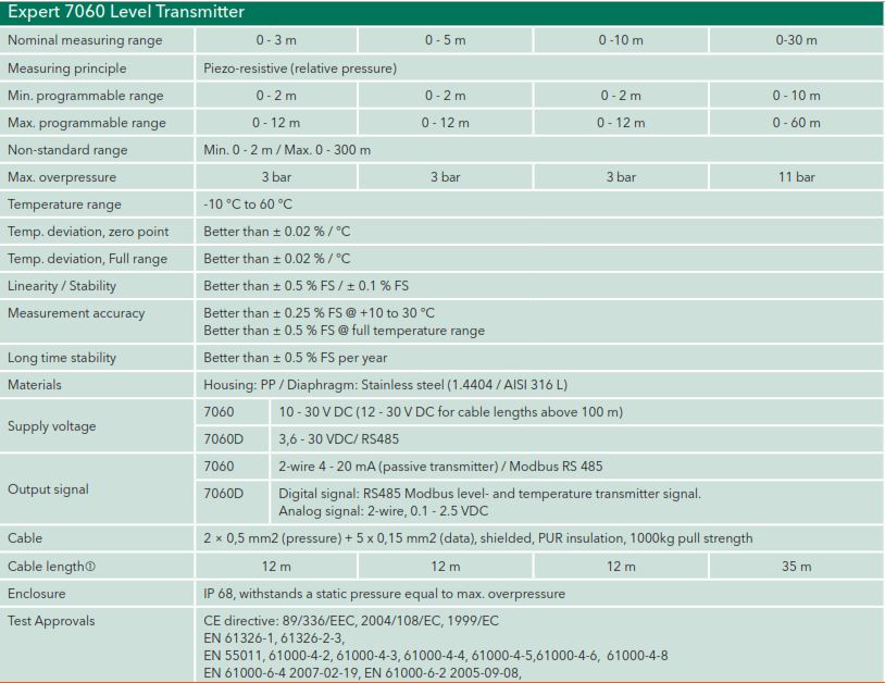 Thiết bị quan trắc mực nước thủy tĩnh Expert™ 7060 là cảm biến đo mực nước rất nổi tiếng, được nghiên cứu thiết kế cho việc đo mực nước thải trên khắp thế giới. Expert™ 7060 có hệ thống đo áp trở với bù áp suất không khí trực tiếp qua một ống trong dây cáp. Đầu cảm biến thích hợp để đo mực nước thải ở các trạm bơm, thùng và bồn chứa ở các nhà máy rác thải, nước thải công nghiệp, cũng như các nhà máy công nghiệp.